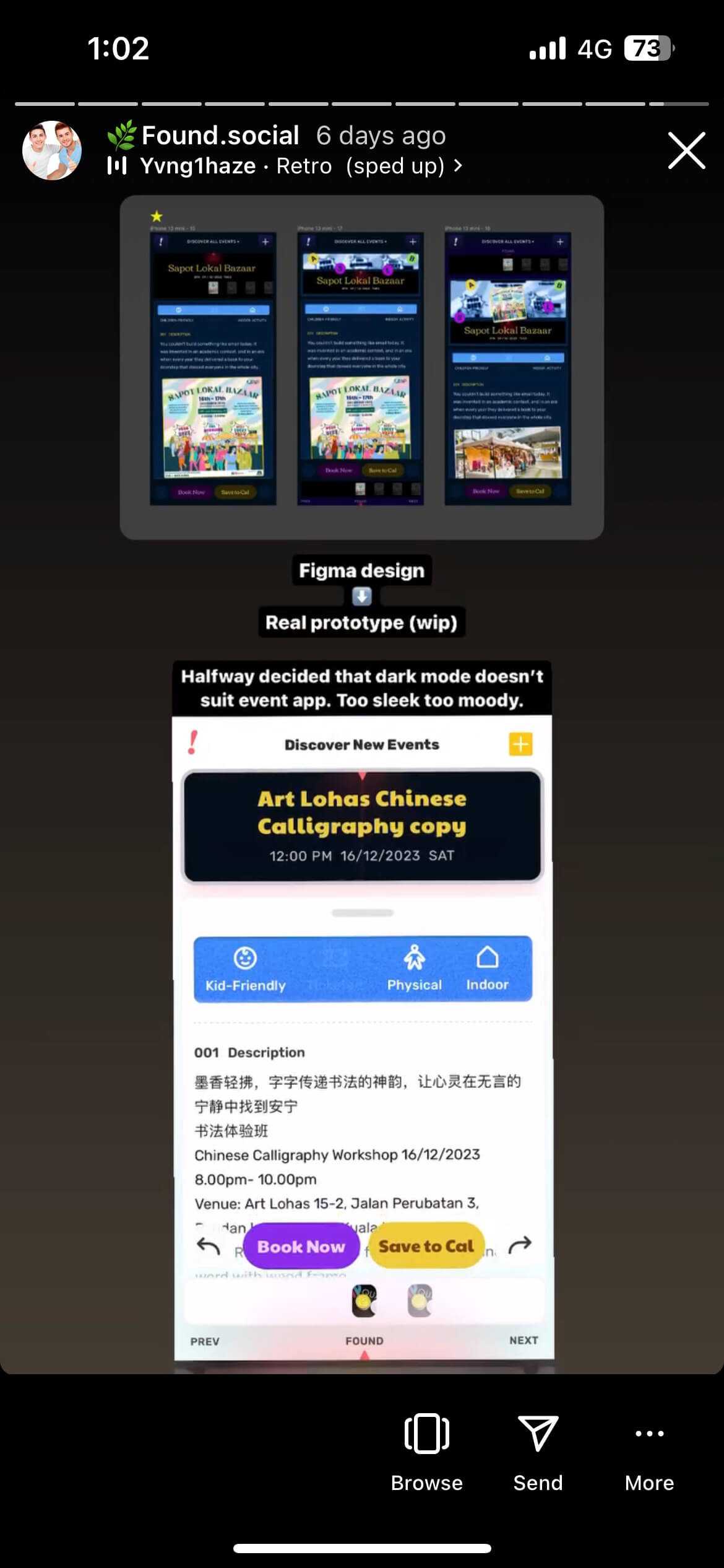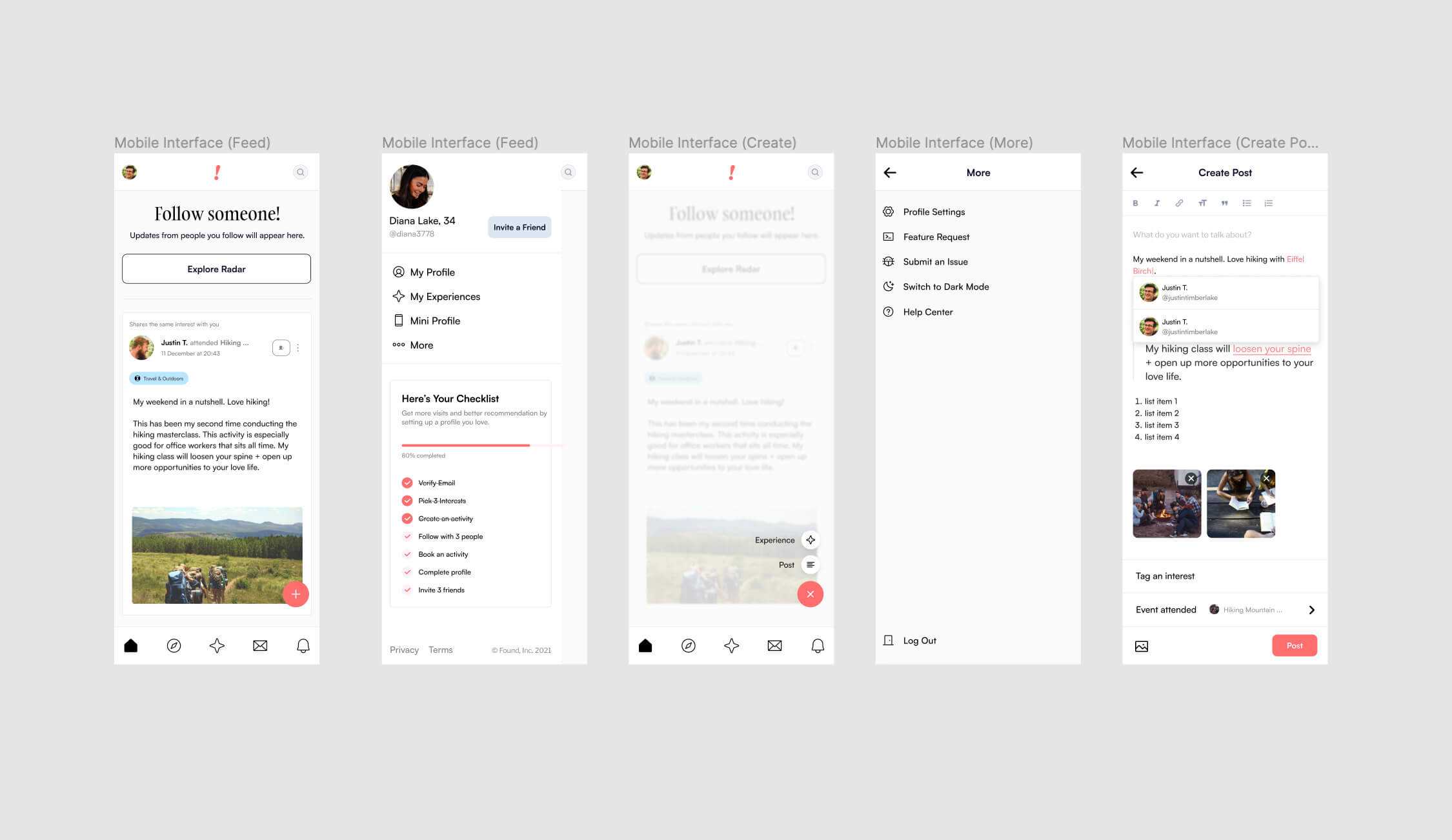 I envisioned a social media platform like Facebook or Instagram, but with a twist: a dedicated space for people to discover and share passions, experiences, activities, and local events. Through Found!, users could learn new skills, explore hidden interests, meet like-minded individuals, or find something fun to do with friends and family.