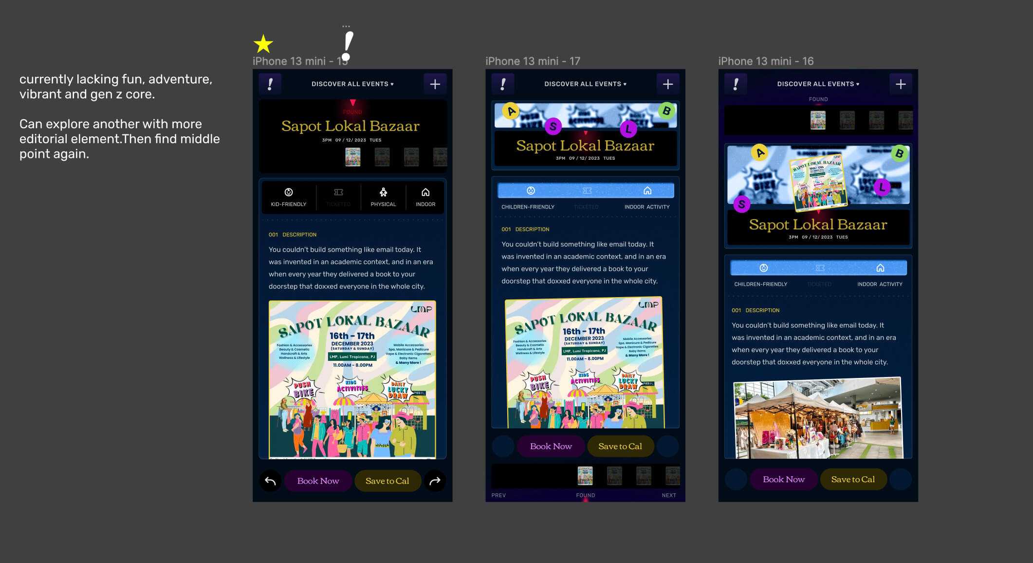 - Event-goers: Explore new events easily with a simple swipe-to-discover interface. Then, book directly from external site or save them to your calendar.