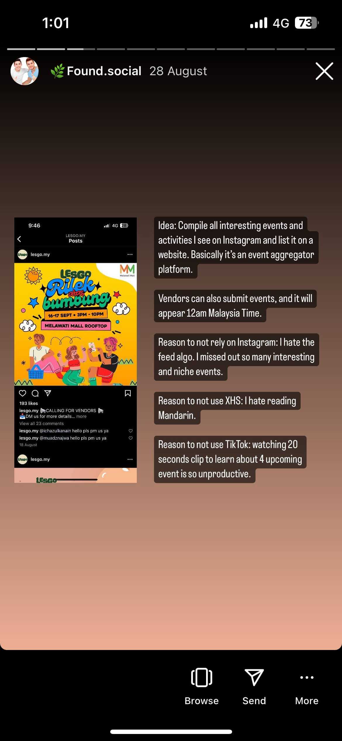 - Event organisers: Submit basic information through an Airtable form, and your event appears on the website next midnight. Because of this, Found is extremely suitable for free and small events who already has their own payment gateway e.g. WhatsApp business.